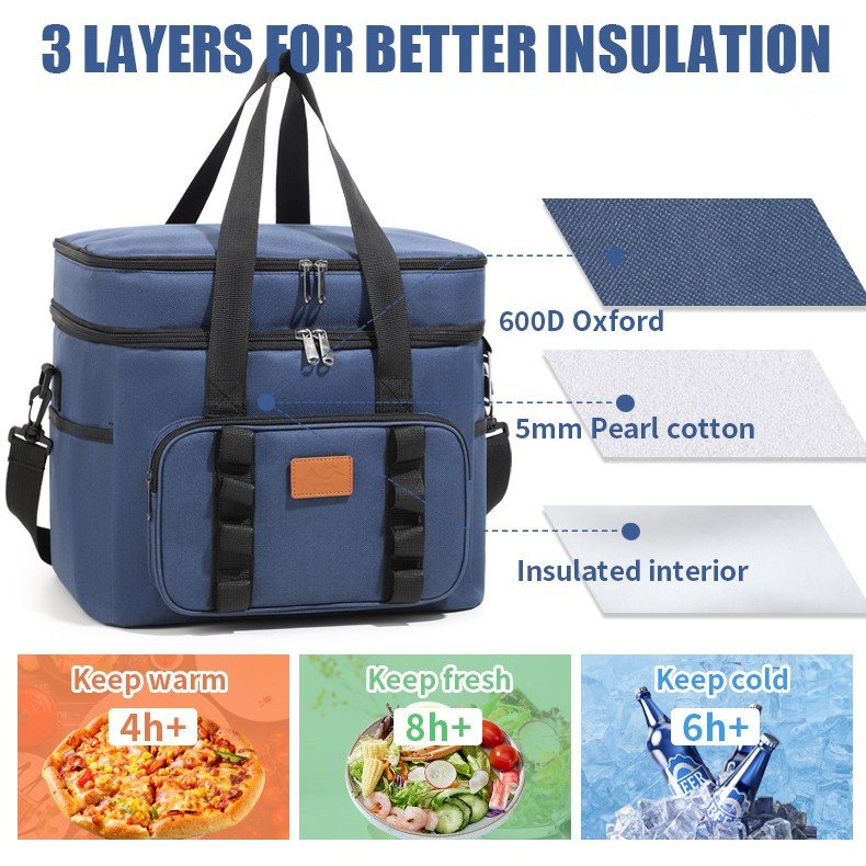 EXTENDED CHILL TIME: Featuring an innovative 3-layer insulation design, the cooler bag ensures that your items stay refreshingly cold for longer periods. With a durable exterior made of rip-stop 600D Oxford fabric and a waterproof PVC layer, the interior is crafted with reinforced food-grade PEVA materials for leak-proof and tear-resistant performance. The built-in EPE foam middle layer and 210D liner provide additional insulation, keeping your items cold for up to 12 hours.