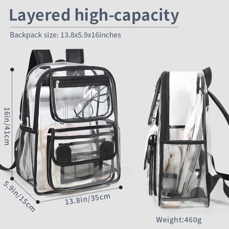Durable and Waterproof Design: This PVC clear backpack is designed to withstand the rigors of daily use, featuring a waterproof material that protects your belongings from the elements.Its durable construction ensures it will last for a long time, making it a great investment for students who need a reliable bag.